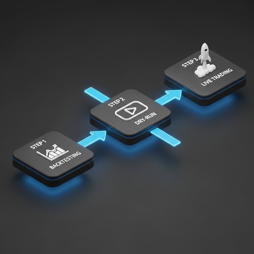 Pero antes de que te emociones y conectes la tarjeta de crédito, déjame ser muy claro, y esto es lo más importante que leerás hoy: la clave del éxito aquí no es la codicia, es la paciencia. La filosofía es probar, probar y volver a probar. Primero se testea en el pasado (backtesting), luego se simula en tiempo real sin dinero (dry-run), y solo cuando estás seguro, pones dinero real. Para visualizar este proceso disciplinado, imagina el flujo de trabajo que seguiremos.