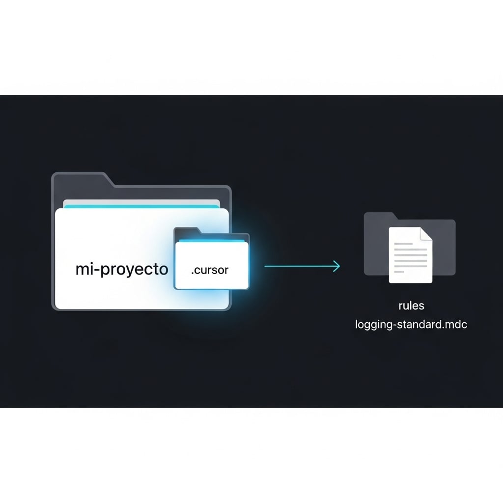 Estas reglas se configuran en archivos de texto dentro de una carpeta .cursor/rules en la raíz de tu proyecto, lo que te permite versionarlas con Git y compartirlas con todo el equipo. Visualizar esta estructura ayuda a entender lo simple que es empezar.